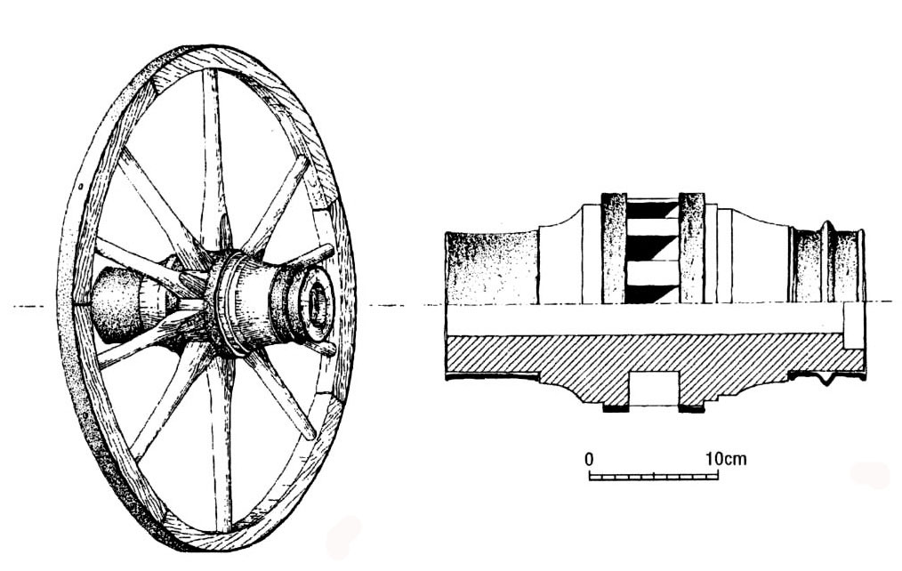 Kresebná rekonstrukce náboje (hlavy) a celého kola (průměr ca. 80 cm) dvoukolového vozu z bezdědovického nálezu. Návrh a kresba J. Bernat.