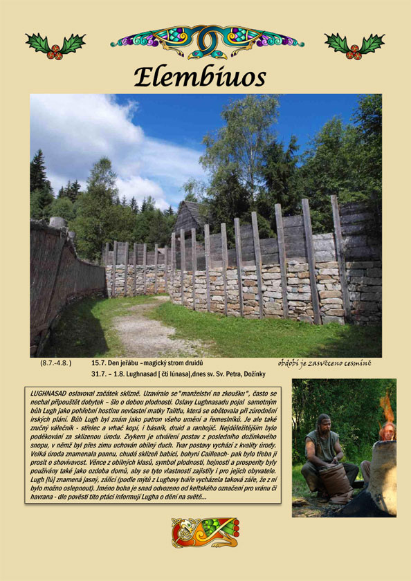elembiuos-wLUGHNASAD oslavoval začátek sklizně. Uzavíralo se"manželství na zkoušku", často se nechal připouštět dobytek – šlo o dobou plodnosti. Oslavy Lughnasadu pojal samotným bůh Lugh jako pohřební hostinu nevlastní matky Tailtlu, která se obětovala při zúrodnění irských plání. Bůh Lugh byl znám jako patron všeho umění a řemeslníků. Je ale také zručný válečník - střelec a vrhač kopí, i básník, druid a ranhojič. Nejdůležitějším bylo poděkování za sklizenou úrodu. Zvykem je utváření postav z posledního dožínkového snopu, v němž byl přes zimu uchován obilný duch. Tvar postavy vychází z kvality úrody. Velká úroda znamenala pannu, chudá sklizeň babici, bohyni Cailleach- pak bylo třeba ji prosit o shovívavost. Věnce z obilných klasů, symbol plodnosti, hojnosti a prosperity byly používány také jako ozdoba domů, aby se tyto vlastnosti zajistily i pro jejich obyvatele. Lugh [lú] znamená jasný, zářící (podle mýtů z Lughovy tváře vycházela taková záře, že z ní bylo možno oslepnout). Jméno boha je snad odvozeno od keltského označení pro vránu či havrana - dle pověsti tito ptáci informují Lugha o dění na světě…